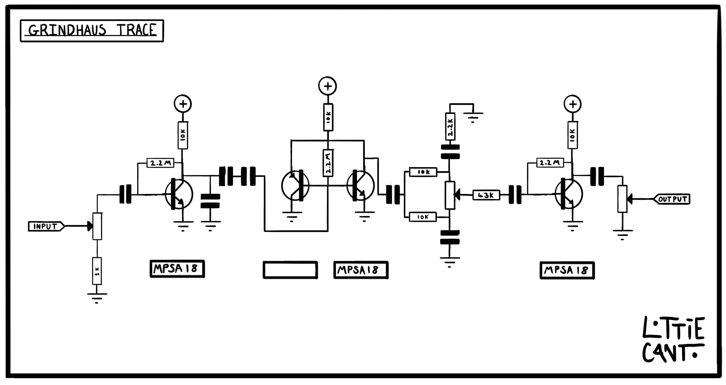 So after a quick look through the archives of Devi’s circuits I found the one. The Devi Ever Hyperion was part for part identical to the first half of the Grindhaus (according to the resistor values I had) with the same transistors too. This is great news as it also tells us what that unknown transistor value is and also the value of those capacitors.